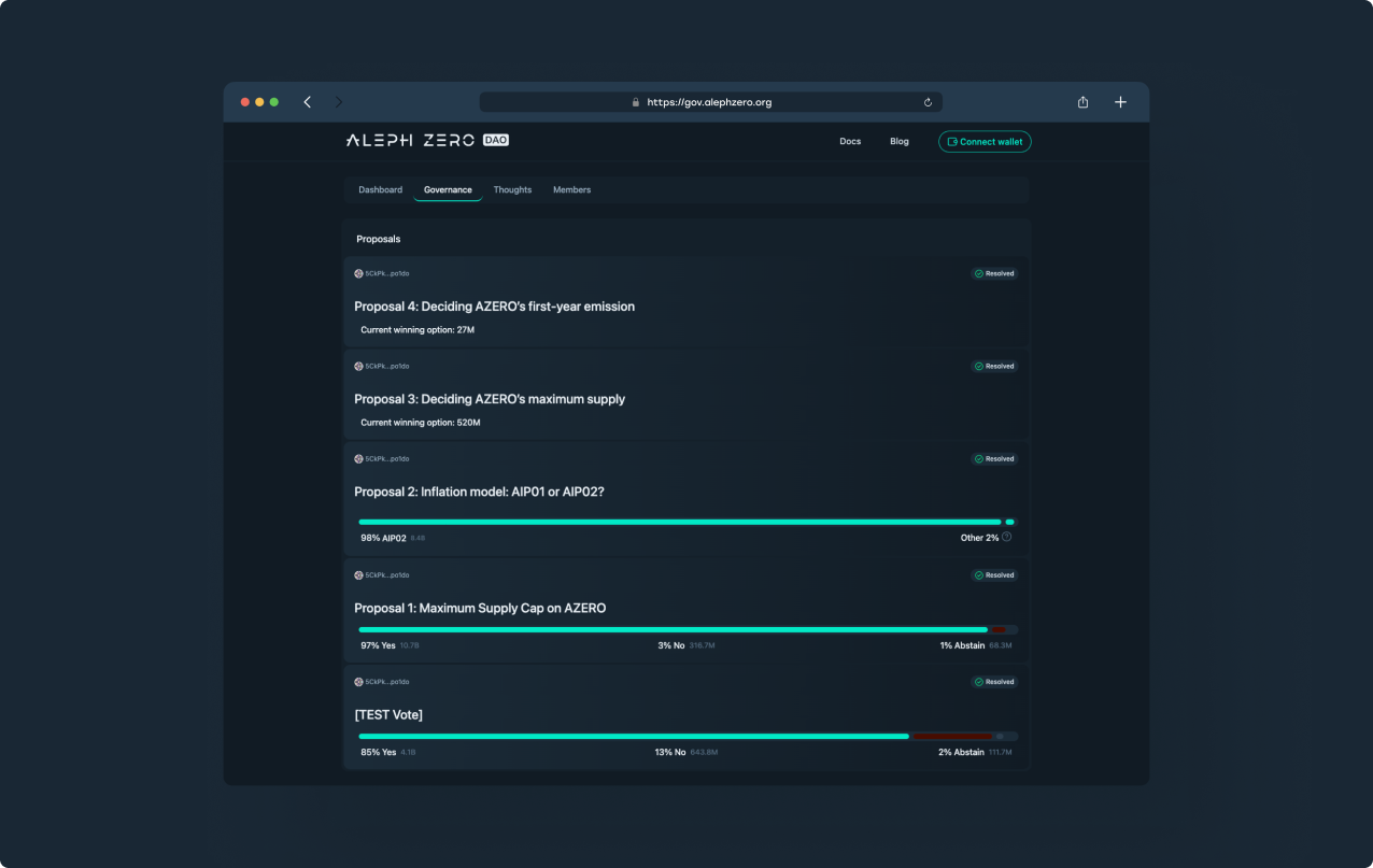 Built with a focus on transparency and engagement, the platform features comprehensive voting statistics, power metrics, and top voter tracking. The integration of forum functionality enables community discussions and proposal refinement, fostering deeper collaboration in the Aleph Zero ecosystem.