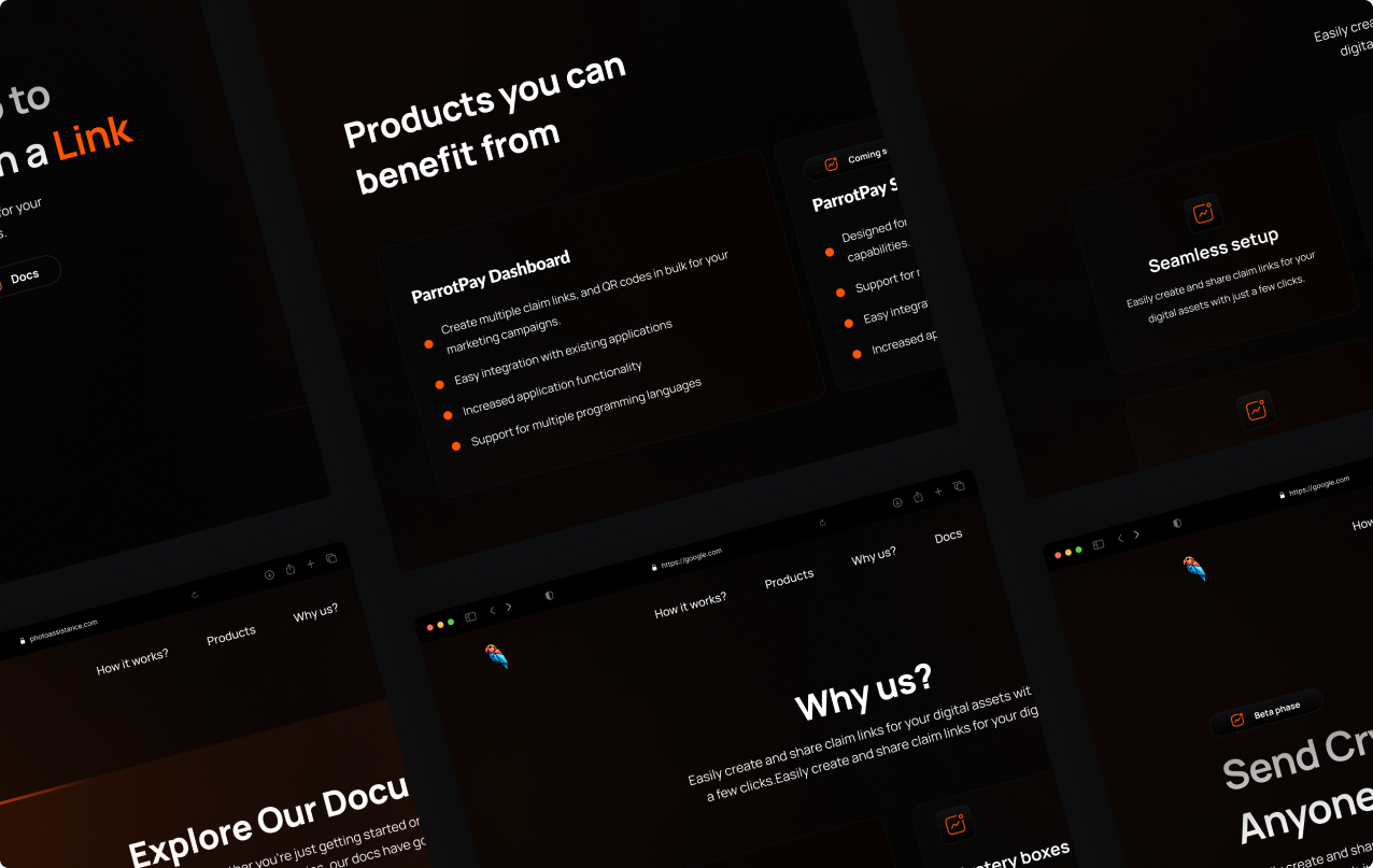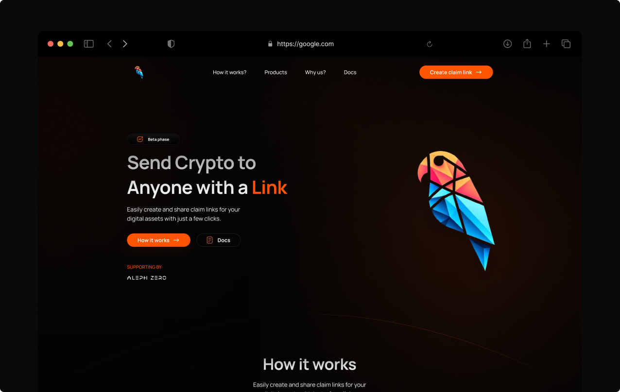 The platform supports multiple token types including native currencies, PSP22/ERC20 tokens, and NFTs, providing a versatile solution for both personal transfers and business campaigns. Through intuitive link-based sharing, ParrotLink bridges the gap between Web2 and Web3, enabling seamless crypto adoption for non-technical users.