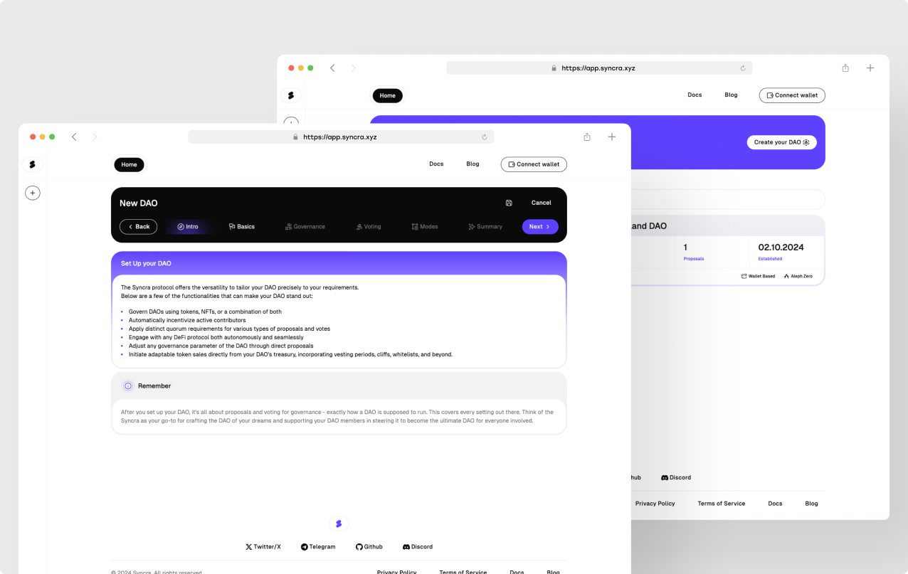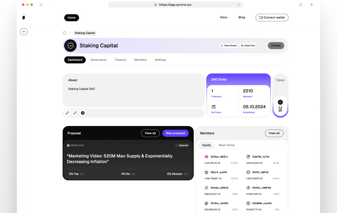 Developed in collaboration with Aleph Zero through their Ecosystem Funding Program, Syncra addresses critical governance challenges in the Web3 space. Our platform combines privacy-preserving voting mechanisms with customizable governance tools, allowing organizations to scale their decision-making processes while maintaining member confidentiality.