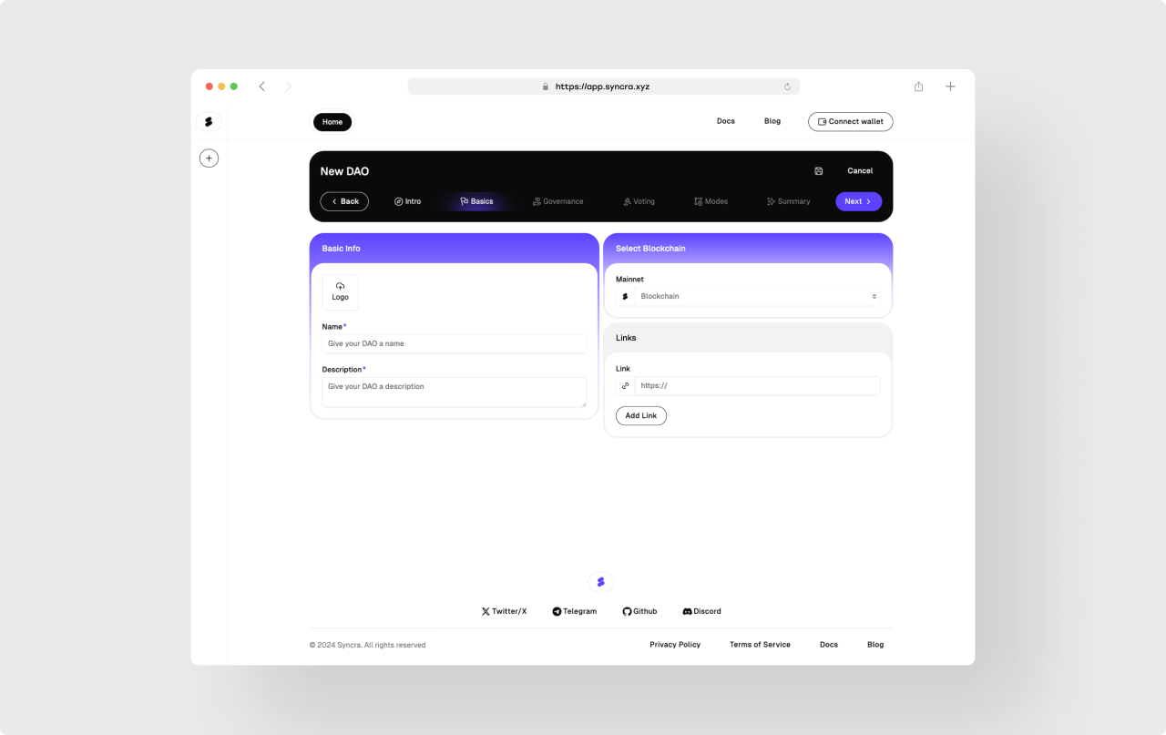 Working closely with Properly Studio, who provided the designs and whole UX of the app, we've reimagined DAO interactions to create the most intuitive governance experience in the industry. By stripping away technical complexity and focusing on human-centered workflows, Syncra makes decentralized governance accessible to organizations of all technical backgrounds.